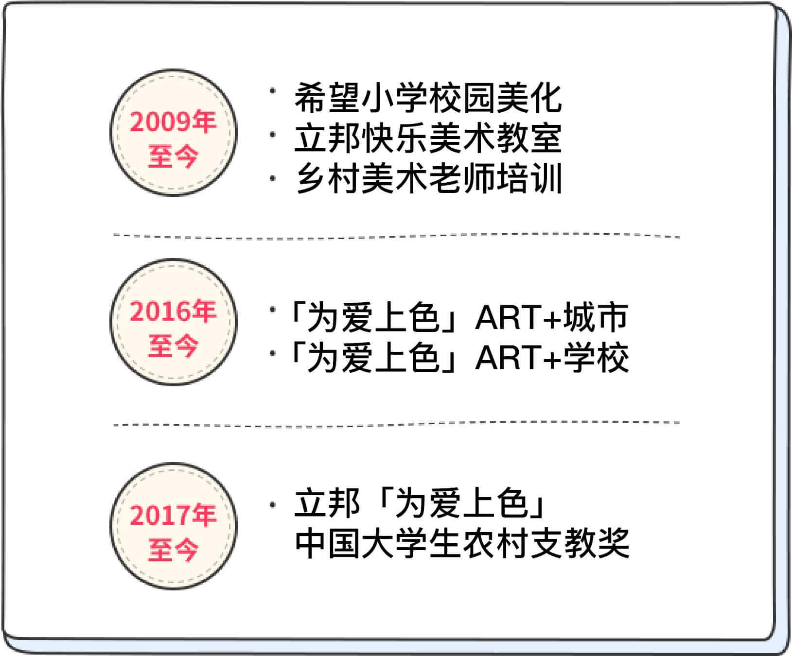 2017年,立邦中國加入共青團中央學(xué)校部指導(dǎo)下發(fā)起的“中國大學(xué)生知行促進計劃”,響應(yīng)建設(shè)“美麗中國”號召,結(jié)合“一帶一路”和“精準(zhǔn)扶貧”政策 ,開展“立邦「為愛上色」中國大學(xué)生農(nóng)村支教獎”,鼓勵全國高校大學(xué)生深入鄉(xiāng)村,開展助學(xué)支教、傳統(tǒng)村落建筑及文化遺產(chǎn)調(diào)研等實踐活動。